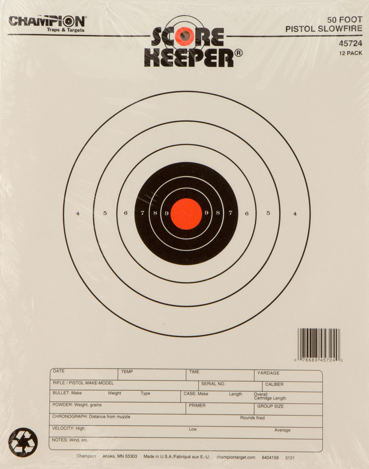 For the serious plinker and competition shooter, Champion’s Score Keeper targets offer brightly colored designs with a notes section for scoring your success. Target is patterned for 50 ft Pistol Slowfire. It comes in a 12 pack of 11″ x 16″ targets.